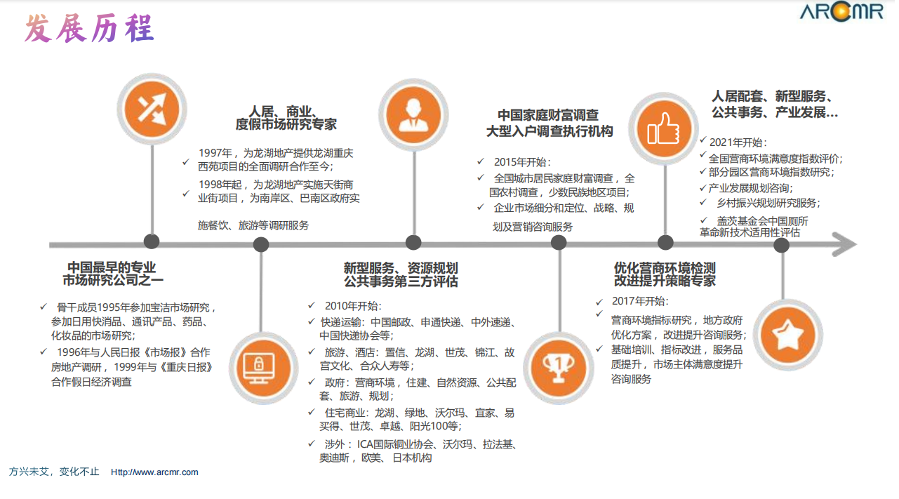 2015~2020年,开始提供境外市场研究,实施中国财富调查等大型政府项目,提供第三方评估服务。研发调查实训、计算机辅助面访、人居消费与营销管理、业主满意度及服务改进、商用物业智能化管理、游客大数据云端数据分析等操作系统。提供发展规划、营商环境、产业投资、绩效评估、精准扶贫及乡村振兴和文明城市建设、乡村旅游、生态环境等调研咨询服务,可以提供顾问型行动策略咨询服务。设立广州分公司、安徽分公司、银川分公司。